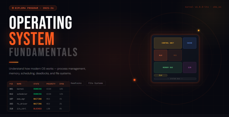 This course introduces the fundamental concepts of Operating Systems for Diploma in Computer Technology students. Students will learn about the structure and functions of operating systems including process management, memory management, file systems, CPU scheduling, and deadlocks. The course focuses…
